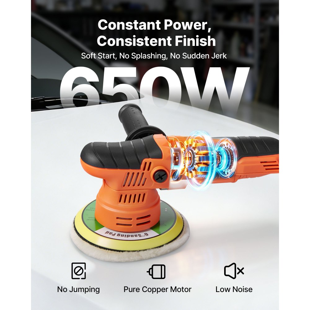 Restaura el brillo del coche: Equipada con un motor de 650 W, esta pulidora VEVOR ofrece una potencia estable para mejorar el acabado de la pintura, ayudando a eliminar suciedad, oxidación y marcas superficiales para un resultado limpio y uniforme