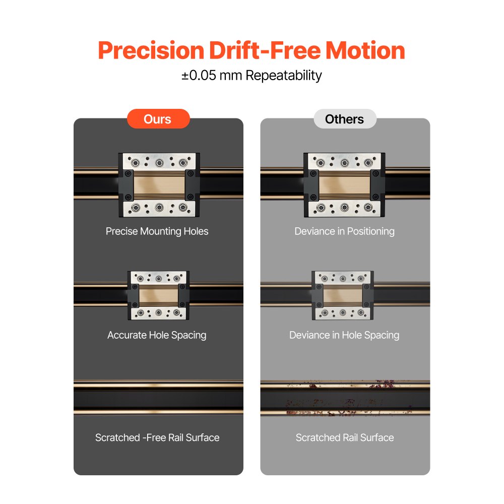 Alta precisión, sin desviaciones: Con una repetibilidad de más o menos de 0,05 mm, nuestro riel guía de movimiento lineal cuenta con orificios de montaje y espaciado mecanizado con precisión. Garantiza un movimiento preciso de carrera larga y una fácil instalación