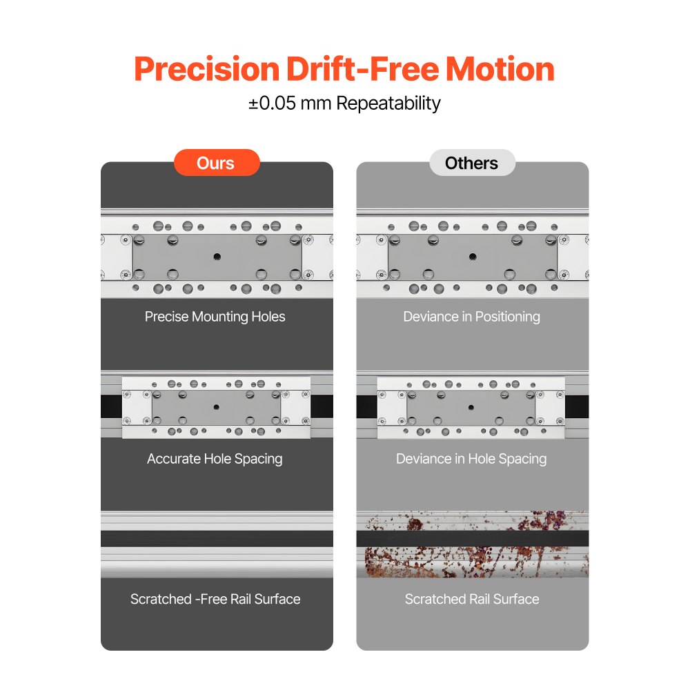 Alta precisión, sin desviaciones: Con una repetibilidad de más o menos de 0,05 mm, nuestro riel guía de movimiento lineal cuenta con orificios de montaje y espaciado mecanizado con precisión. Garantiza un movimiento preciso de carrera larga y una fácil instalación