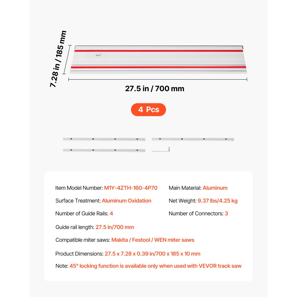 Riel Guía para Sierra de Mesa, Rango de Corte de 279,4 cm, Incluye 4 Rieles Guía de Aluminio Extruido de 698,5 mm y 3 Conectores, Compatible con Makita, Festool y WEN, para Carpintería - Herramientas manuales