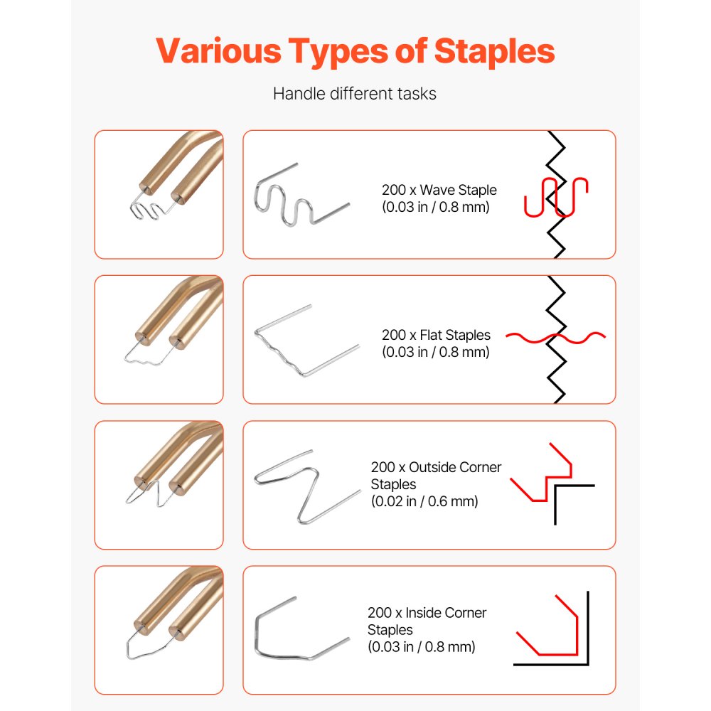 Amplias aplicaciones: Esta soldadora de plástico a batería ofrece 400 piezas de 4 tipos de grapas calientes para diversas necesidades de reparación de plástico. Con grapas de onda grandes y pequeñas, grapas en forma de V y en forma de M, es ideal para reparar parachoques de automóviles, tableros, bases de lámparas, anillos de plástico, motocicletas y artículos de plástico de uso diario