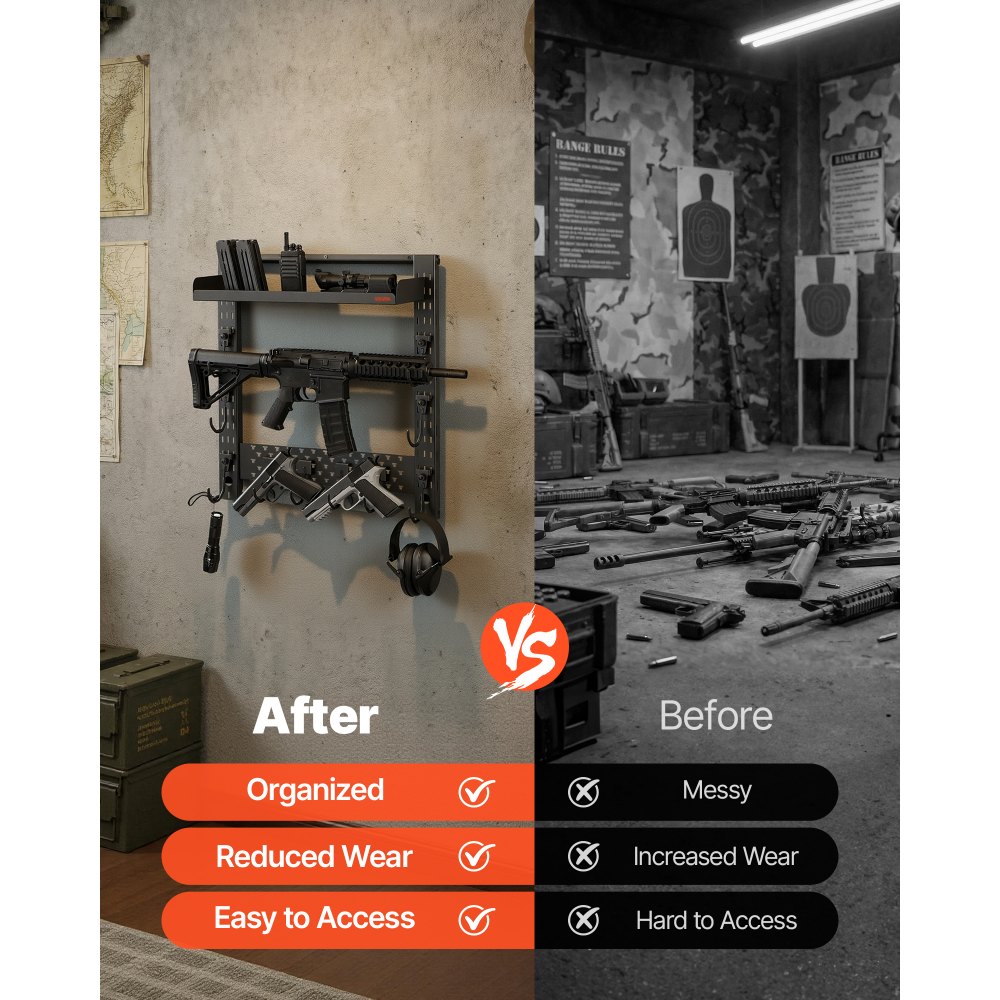 Solución de almacenamiento eficiente: Diseñado con una bandeja superior y ganchos adicionales, el estante para armas de montaje en pared proporciona almacenamiento para equipo táctico, cascos y gafas, lo que mejora significativamente la eficiencia del almacenamiento