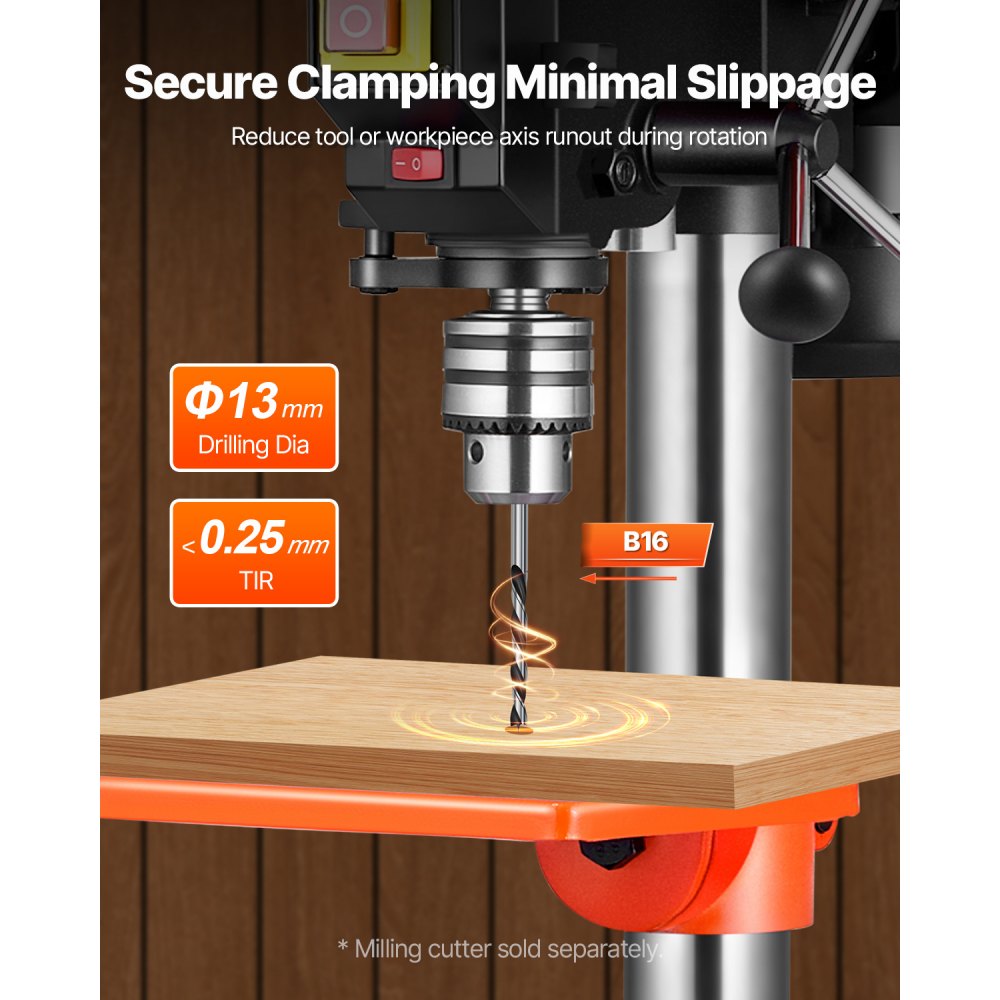 Perforación de precisión: Consiga resultados impecables con la baja desviación radial de nuestro taladro de columna y un diámetro máximo de perforación de 13 mm. El tope de profundidad ajustable y el recorrido del husillo de 50 mm le permiten ajustar la profundidad de perforación para obtener agujeros perfectos en todo momento