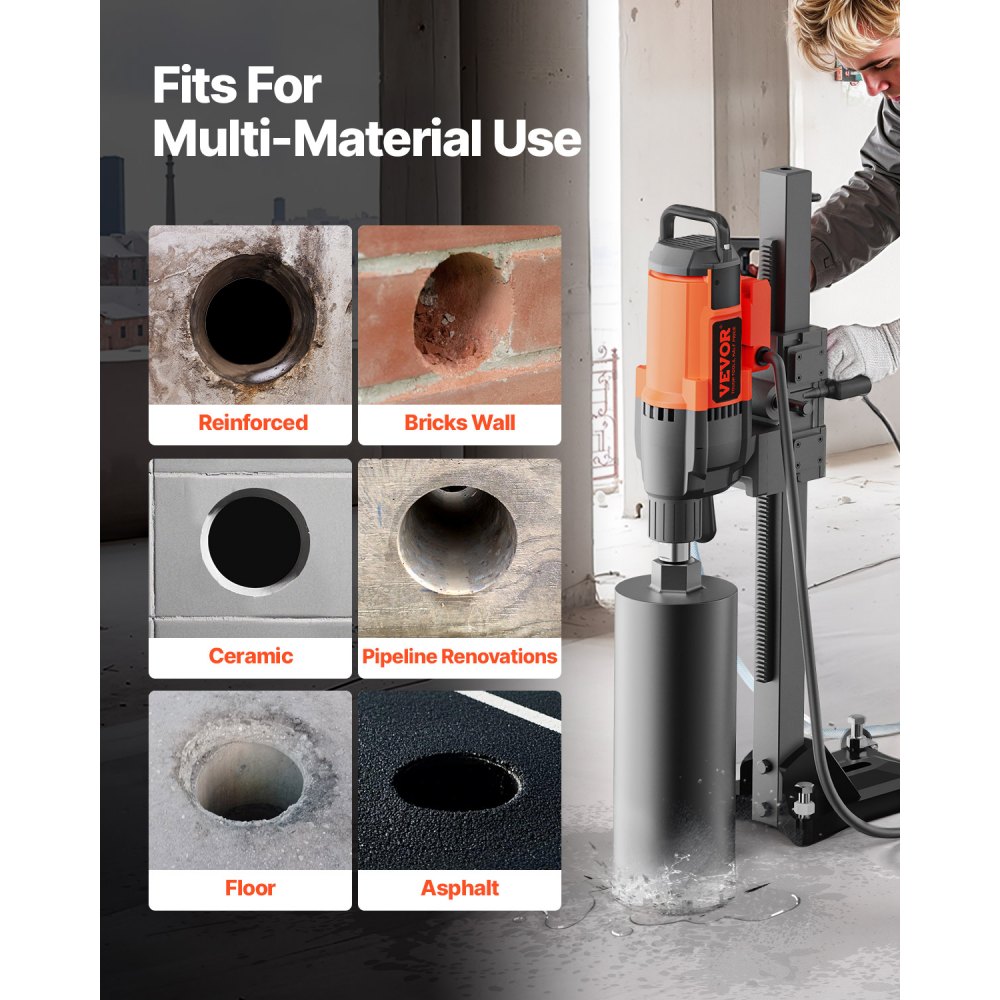 Construido para perforación de hormigón de servicio pesado: Fácil de maniobrar para perforar hormigón reforzado, ladrillo rojo, mármol y otros materiales. Nuestro equipo de perforación con núcleo de diamante húmedo seguramente satisfará las demandas profesionales y es más que solo para uso doméstico, y puede instalar rápidamente acondicionadores de aire, tuberías de cocina, barandas de escaleras, reparar carreteras, etc.