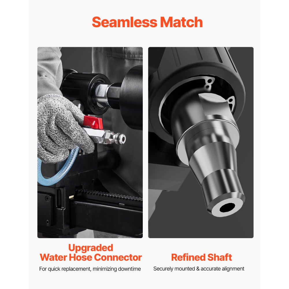Perforación sin esfuerzo: Nuestro taladro de núcleo de hormigón tiene un eje de salida forjado de acero inoxidable para soportar más presión, un conector de tubería de agua de un solo toque mejorado para un suministro de agua estable y 2 ruedas giratorias para que pueda moverse en varias superficies con flexibilidad.