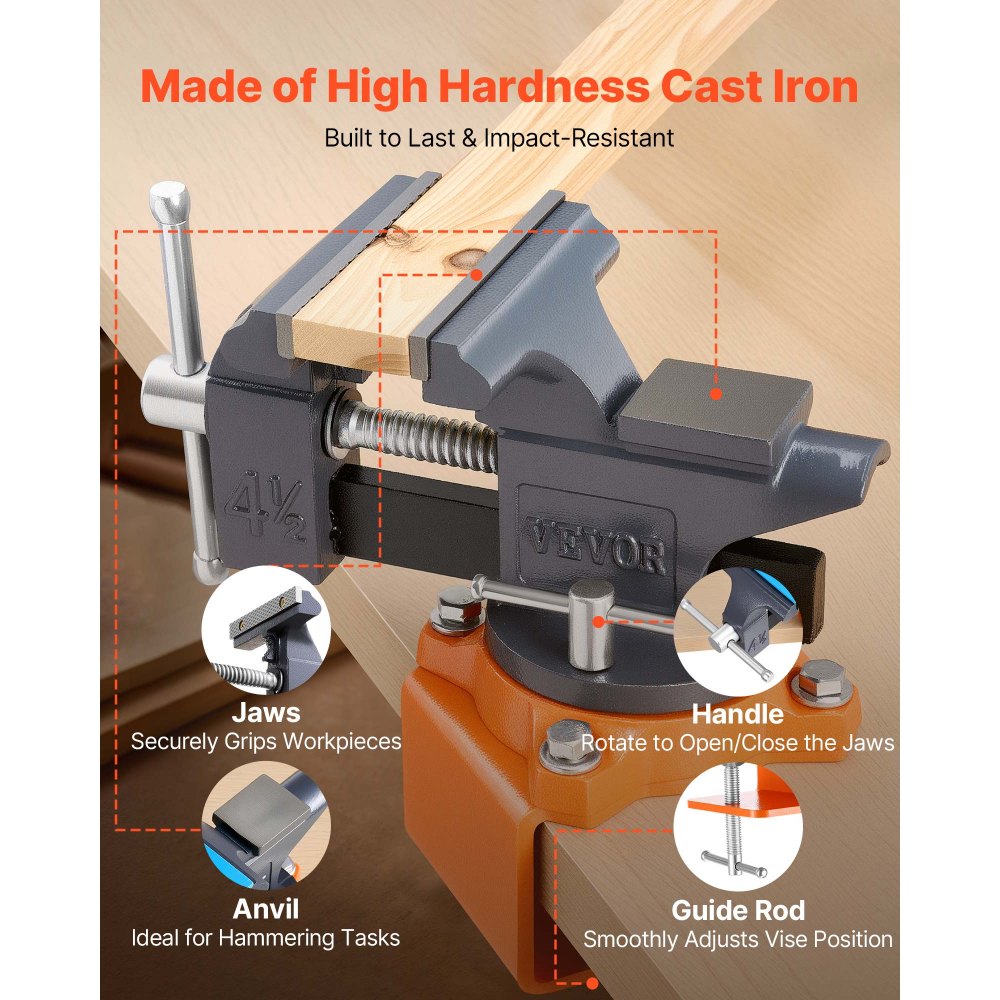 Tornillo de Banco de Mesa, Ancho de la Mandíbula 114,3 mm, Base Giratoria 270°, Construcción de Hierro Fundido, para Carpintería, Taladrado de Metal, Grabado, Rectificado, Soldadura y Corte - Herramientas manuales