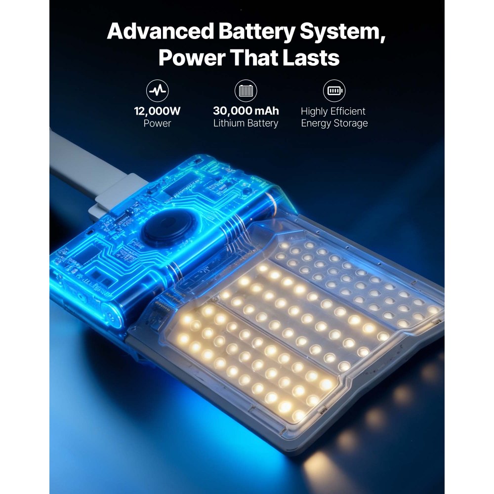 Energía solar de bajo consumo: Nuestra luz de estacionamiento, alimentada íntegramente por energía solar, capta la energía solar y la almacena en una batería de litio de 30,000 mAh durante el día. Una vez cargada por completo, proporciona hasta 20 horas de iluminación continua por la noche