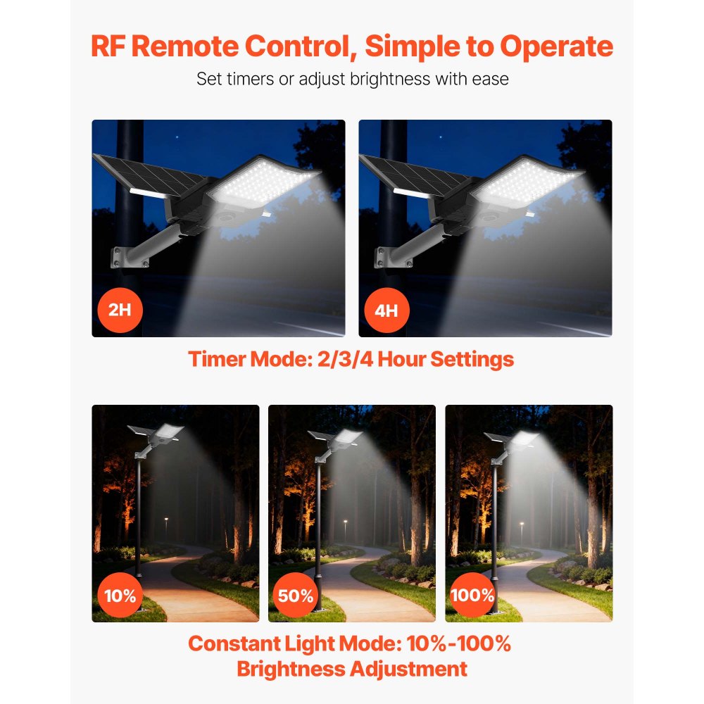 Control remoto y ajuste: Operada mediante un control remoto RF, nuestra farola solar LED ofrece dos modos de iluminación. Puede configurar temporizadores o activar el modo de luz constante. Brillo ajustable del 10 % al 100 % para satisfacer sus diversas necesidades