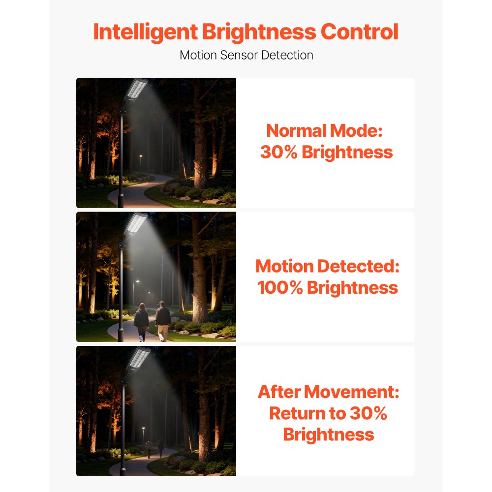 Control inteligente, iluminación ajustable: Controlada mediante control remoto RF, nuestra farola solar LED ofrece 4 modos. El sensor de movimiento ajusta el brillo automáticamente, la detección de luz del anochecer al amanecer se enciende y apaga, cuenta con temporizador y brillo ajustable