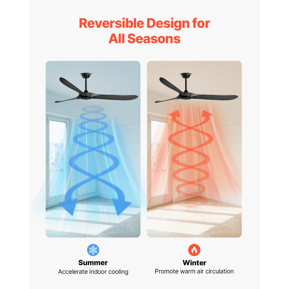 Apto para todas las estaciones: Ya sea primavera, verano, otoño o invierno, este ventilador de techo con motor reversible satisface todas tus necesidades. En verano, gira en sentido antihorario para mejorar la circulación del aire y enfriar la habitación. En invierno, invierte la rotación en el sentido de las agujas del reloj, distribuyendo el aire caliente de manera uniforme para mayor comodidad