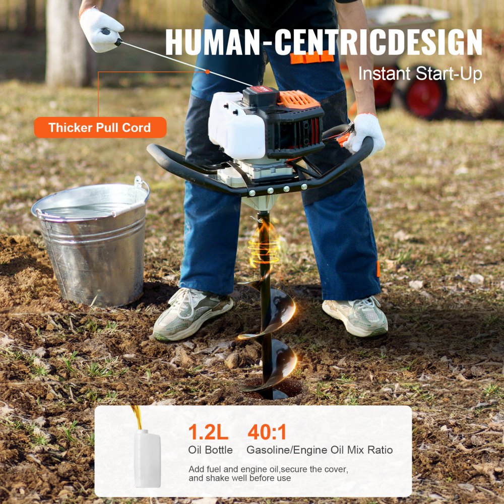 Potente potencia: equipado con un motor de combustible de desplazamiento de 52 cc, la potencia es de hasta 1450 W, la velocidad de rotación puede alcanzar las 9500 rpm y la broca gira hasta 32 rpm, combinándose con la fuerte potencia del motor, puede terminar la tarea de perforación rápidamente y puede lidiar fácilmente con todo tipo de condiciones de suelo y terreno, lo que es adecuado para requisitos de trabajo pesado.