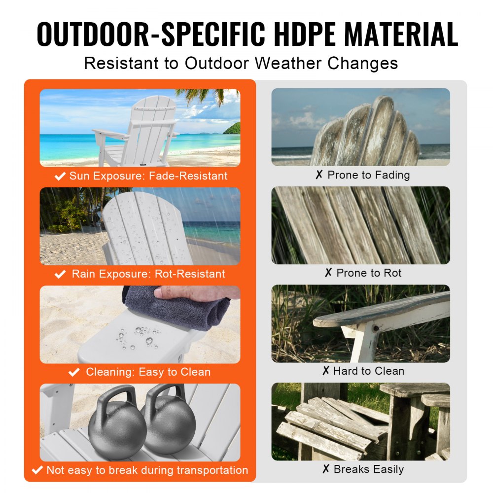 Resistente al calor y al agua: las sillas plegables Adirondack están hechas de plástico HDPE de alta calidad, que resiste el calor, el agua y diversas condiciones climáticas sin deformarse, agrietarse ni pudrirse. Perfectas para patios, jardines, piscinas, playas y porches.