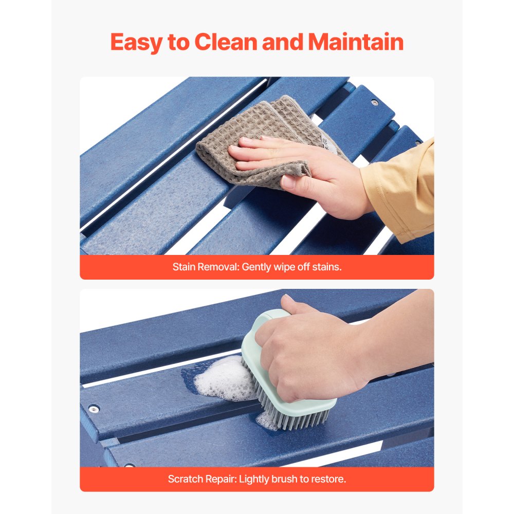 Fácil montaje: solo 4 pasos: Abre los pernos de la cadena, inserta los tornillos, aprieta y asegura el taburete Adirondack. Se monta rápidamente, lo que te ahorra tiempo y esfuerzo. Limpia con agua y jabón, y utiliza un cepillo suave o una esponja de lija para pulir los rayones