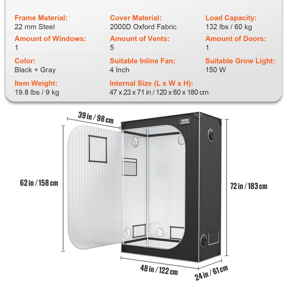 Diseñado para una instalación rápida: ¿Estás listo para ver florecer tus plantas? La tienda de cultivo avanzada VEVOR está hecha de acero resistente de 22 mm, formando una estructura estable que puede soportar hasta 60 kg. Cuenta con conectores metálicos que son fáciles de ensamblar sin herramientas adicionales, lo que ahorra tiempo. Además, la carpa tiene capas triangulares extragruesas que evitan que se rompa, asegurando su durabilidad.