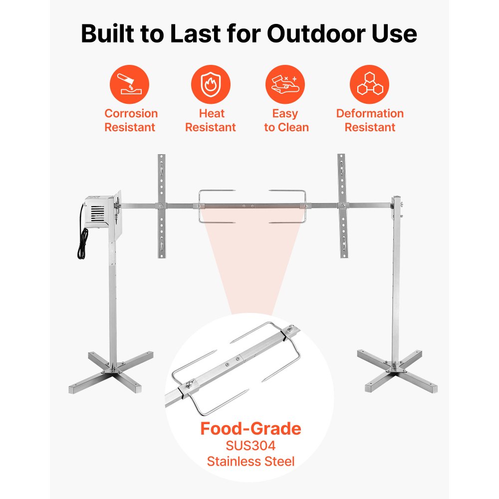 Gran capacidad: Diseñado para soportar hasta 60 kg, el marco de 1321 mm de este asador giratorio permite preparar cerdos, corderos, pavos y más. Ideal para crear comidas abundantes y cocinadas uniformemente que impresionarán a familiares y amigos en cualquier reunión