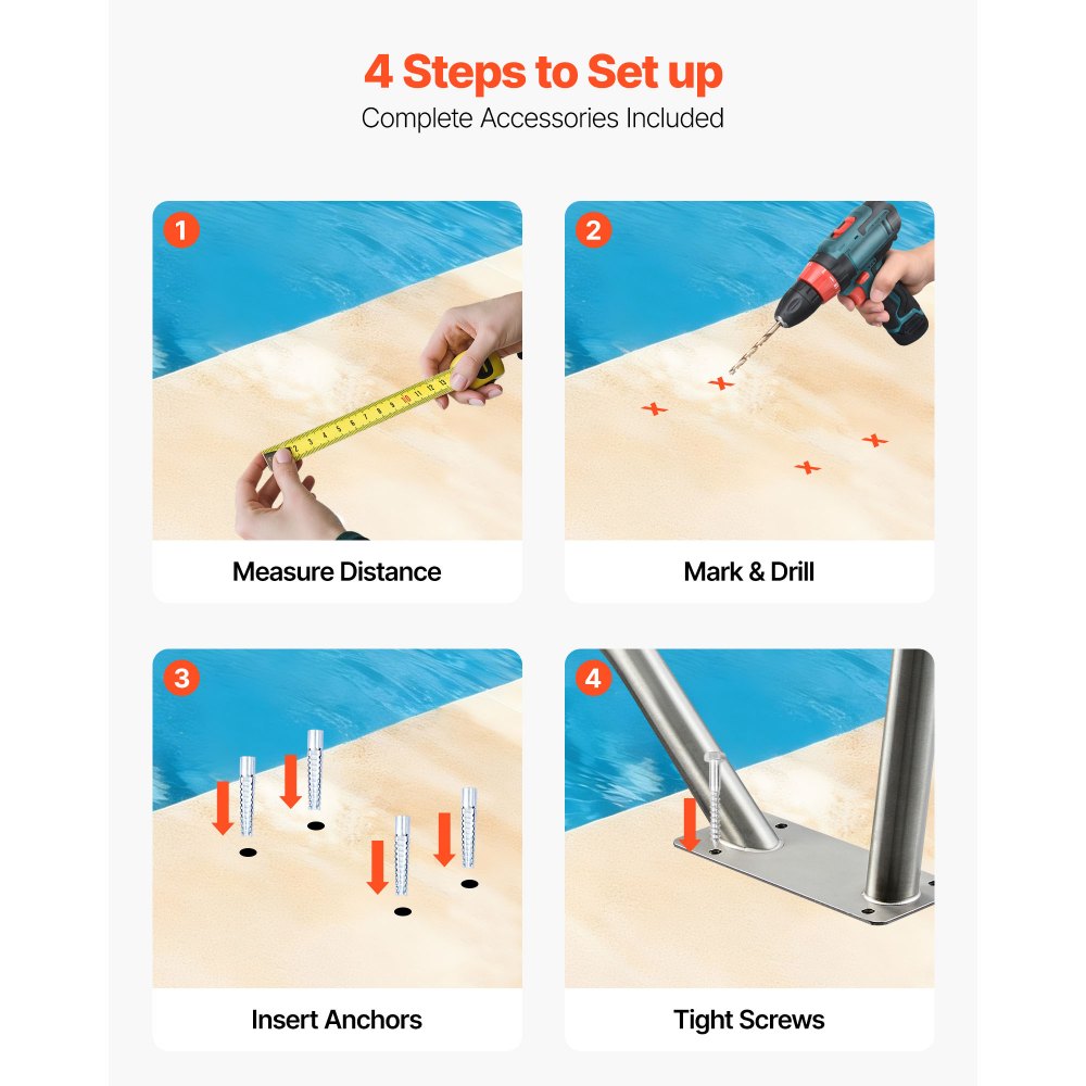 Accesorios completos: Esta barandilla ajustable para piscina incluye tornillos, una llave inglesa y una broca. Utilice su propio taladro para el montaje; no se requieren herramientas adicionales