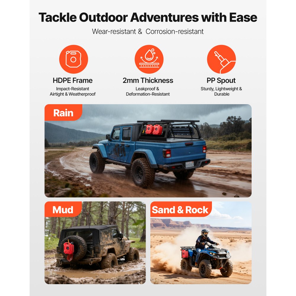 Seguro anti-aflojamiento: No se preocupan las fugas en carreteras con baches. Este bidón de combustible cuenta con una tapa a prueba de fugas, un clip para engranajes y un tubo integrado que lo mantiene hermético en todo momento