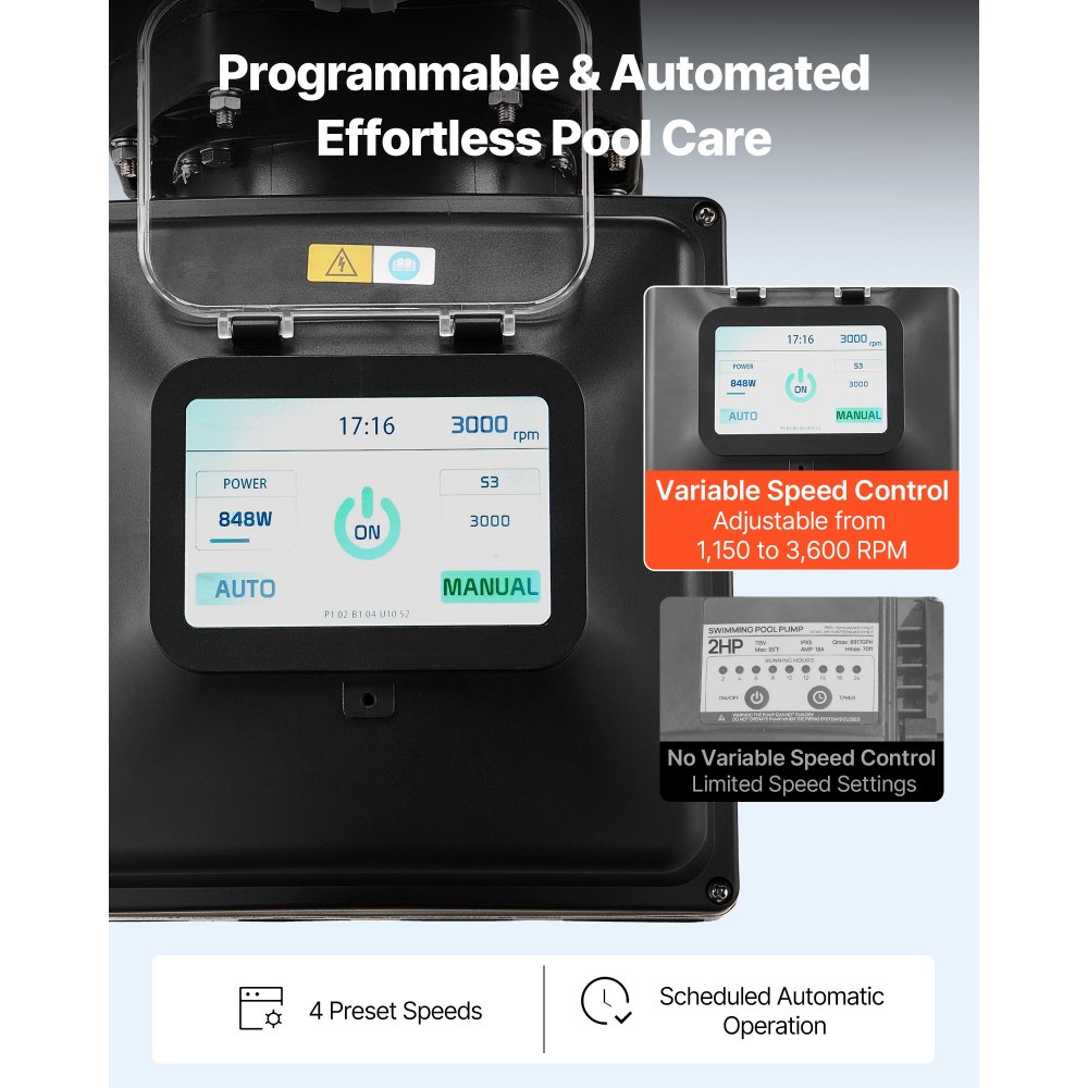 Rendimiento energético optimizado: Esta bomba para piscina de velocidad variable ajusta su velocidad según el tamaño de la piscina y la frecuencia de uso, mejor que las bombas tradicionales de una sola velocidad