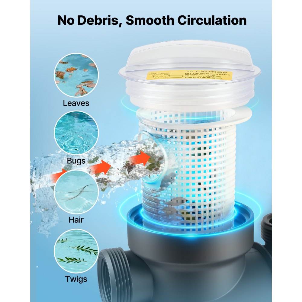 Cesta de filtro y tapa incluidas: Diseñada con una cesta de filtro grande, esta bomba de filtración para piscina ayuda a atrapar los residuos y a prolongar los intervalos de limpieza. La tapa transparente permite una rápida comprobación visual del estado de filtración para facilitar el mantenimiento