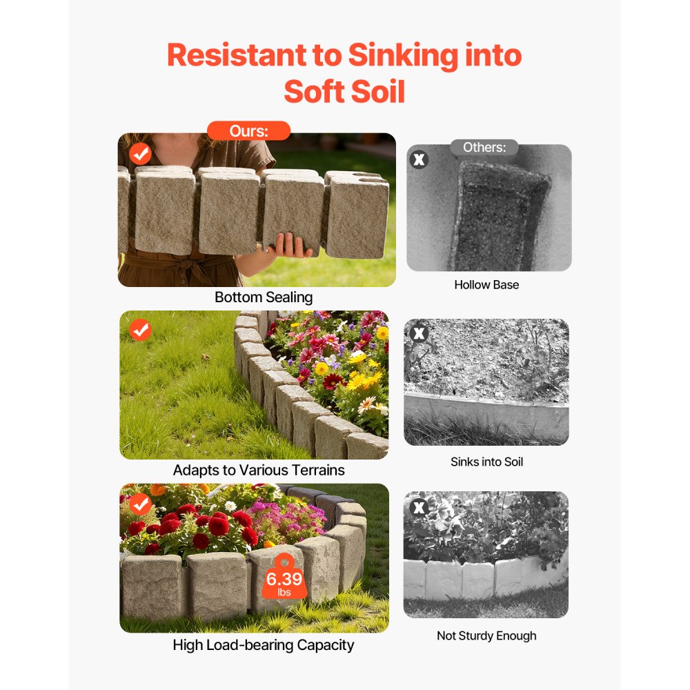 Diseñado para soportar el aire libre: Fabricado con plástico PE de alta calidad mediante moldeo rotacional, el borde de roca artificial para parterres es resistente a la decoloración, el óxido y la corrosión. La superficie texturizada imita la piedra natural, al mismo tiempo que ofrece una excelente protección contra la lluvia, la nieve y los rayos del sol. La carcasa inferior ahuecada evita que se hunda en tierra blanda