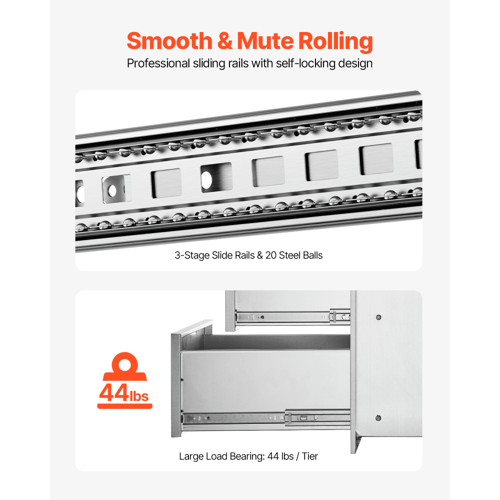 Material de Alta Calidad: Nuestro cajón de cocina al aire libre está hecho de acero inoxidable de grado alimenticio, lo que hace que tenga una excelente dureza y no se erosione fácilmente, sea duradero y resistente al uso. Y también es lo suficientemente duro para contener herramientas de cocina de diferentes materiales.