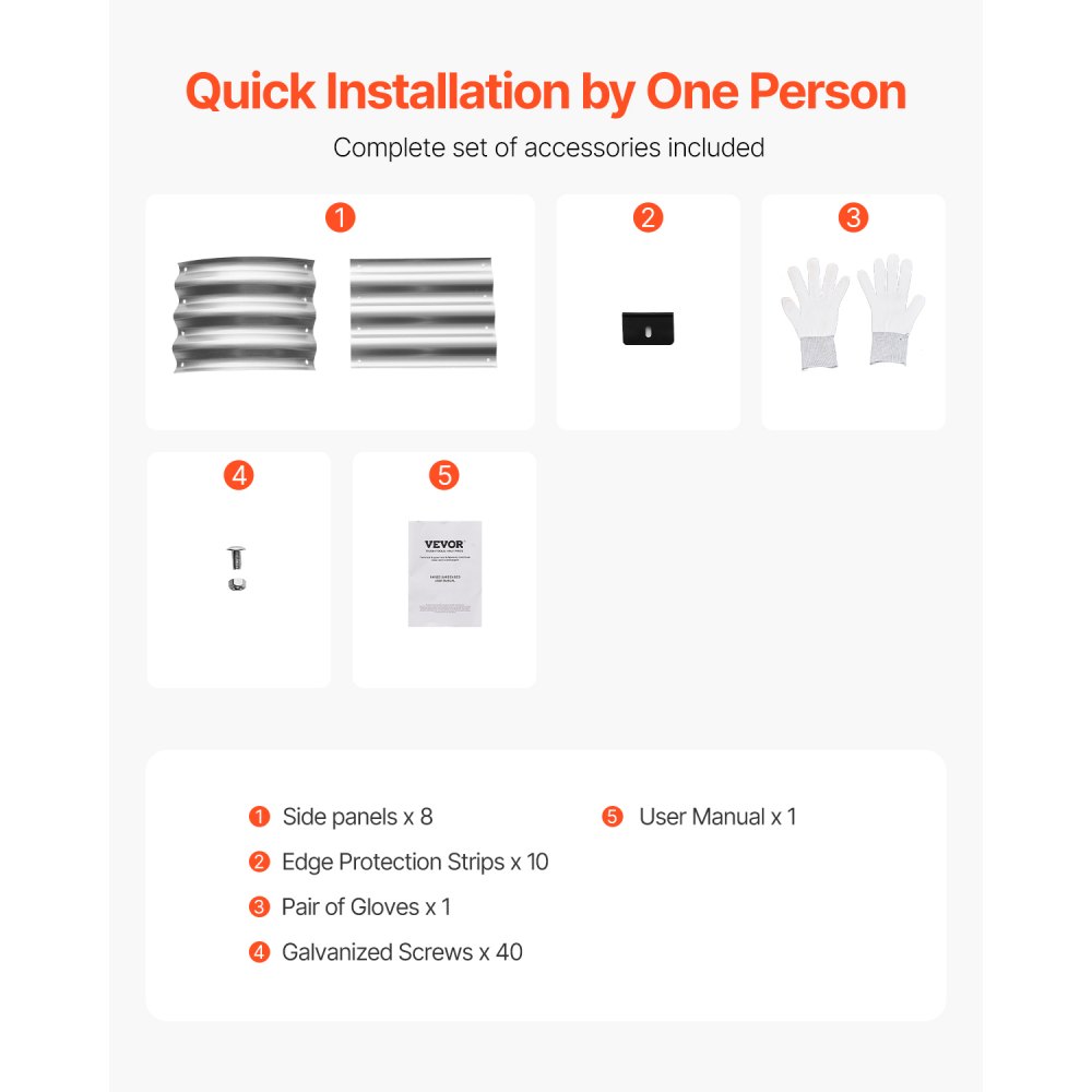 Lo que obtendrás: Nuestra cama de jardín elevada incluye 8 paneles laterales, 10 tiras de protección de bordes, 1 par de guantes, 40 tornillos galvanizados y un manual de usuario