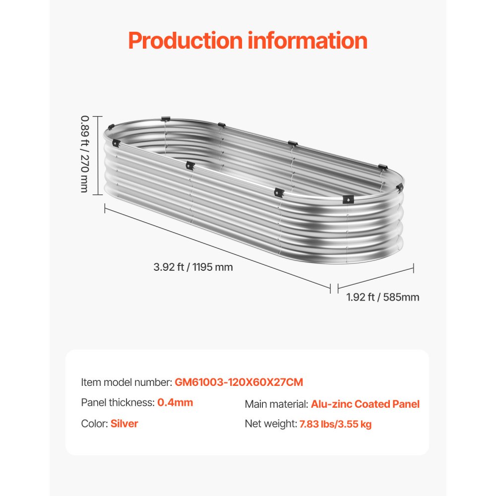 Cama de Jardín Elevada de Metal 1195 x 585 x 270 mm con Fondo Abierto para Exteriores, Jardinera Ovalada Galvanizada para Jardinería de Verduras, Flores, Hierbas y Plantas Suculentas, Plateado - Jardín y césped