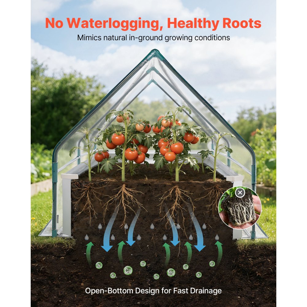 Estructura reforzada y estable: Este arriate elevado cuenta con patas robustas, paneles laterales y barras de refuerzo para evitar que se abulte incluso con tierra húmeda. El invernadero con estructura de acero y cubierta extendida resiste el viento y se mantiene firme en su lugar