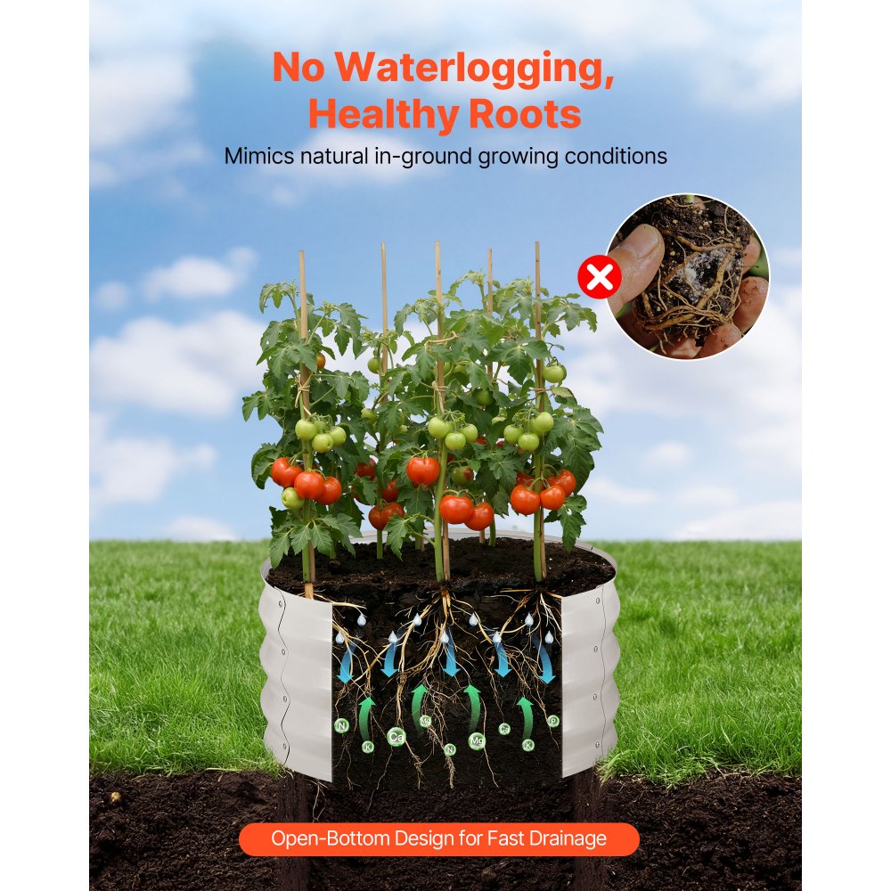 Diseño sin fondo, drenaje rápido: Este bancal elevado cuenta con un diseño de fondo abierto que permite drenar rápidamente el exceso de agua. Favorece el crecimiento saludable de las raíces y la absorción de nutrientes, y reduce las preocupaciones de mantenimiento, incluso durante lluvias intensas o riego excesivo