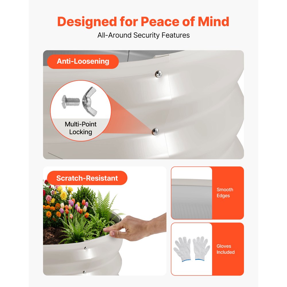 Experiencia de jardinería segura: Con múltiples puntos de conexión y una estructura estable, esta jardinera elevada se instala firmemente sin aflojarse. Los bordes redondeados y los guantes incluidos ayudan a reducir el riesgo de lesiones, lo que garantiza una jardinería segura desde la instalación hasta el cuidado diario