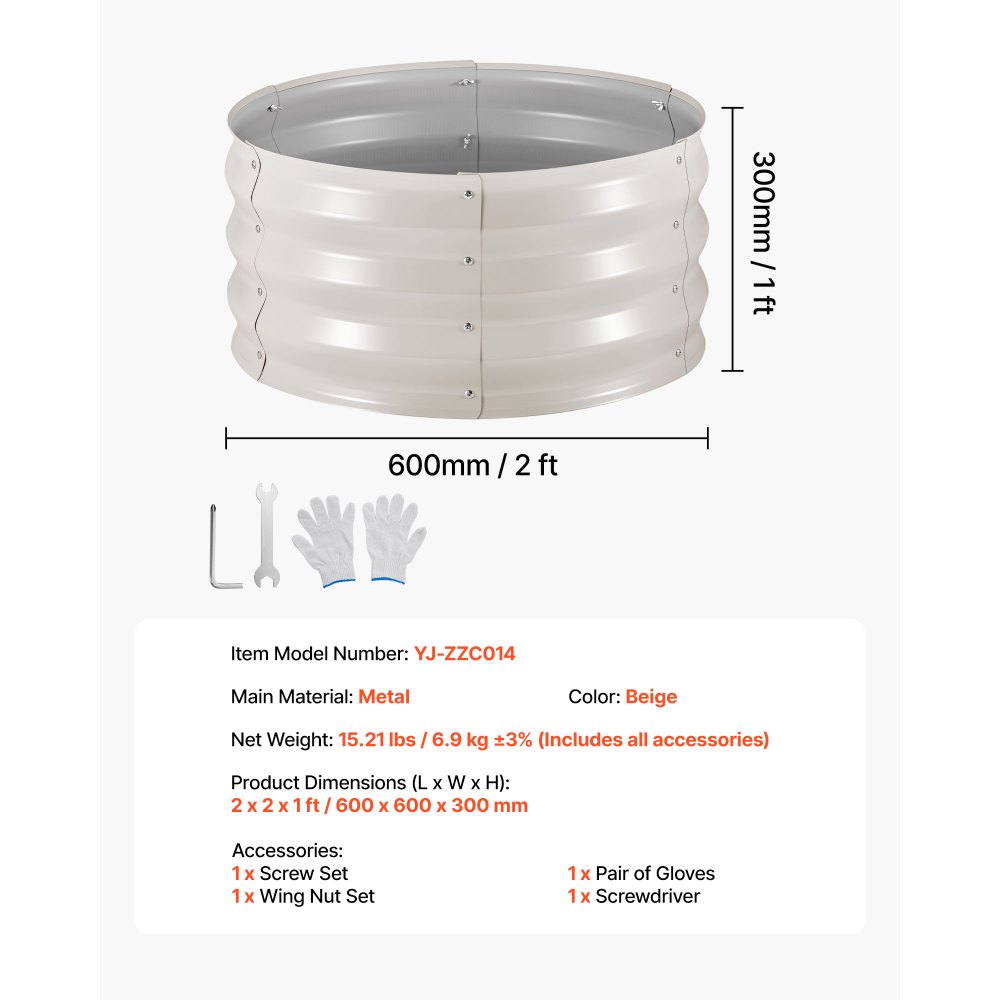 Cama Elevada de Jardín 60 x 60 x 30 cm Ovalada, Arriate de Jardín de Metal con Base Abierta, para Cultivo de Flores Plantas Verduras con Accesorios para Patio Balcón Terraza, 3 Piezas, Beige