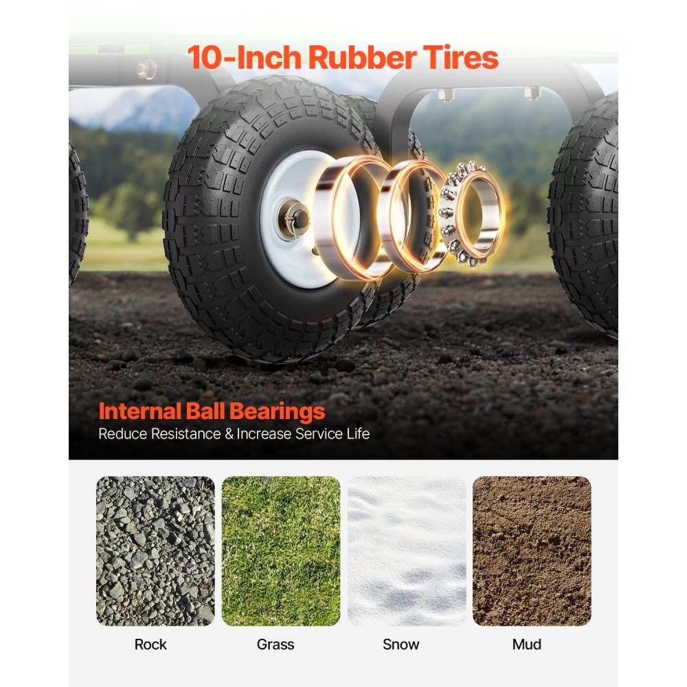 Ruedas giratorias de 360°: Equipadas con neumáticos de goma de 10 pulgadas y ejes de metal, las ruedas de este carrito de jardín de acero resistente garantizan un movimiento suave en diversos terrenos, incluidos césped, barro, rocas y nieve. Su diseño resistente proporciona estabilidad y reduce el esfuerzo necesario para el transporte