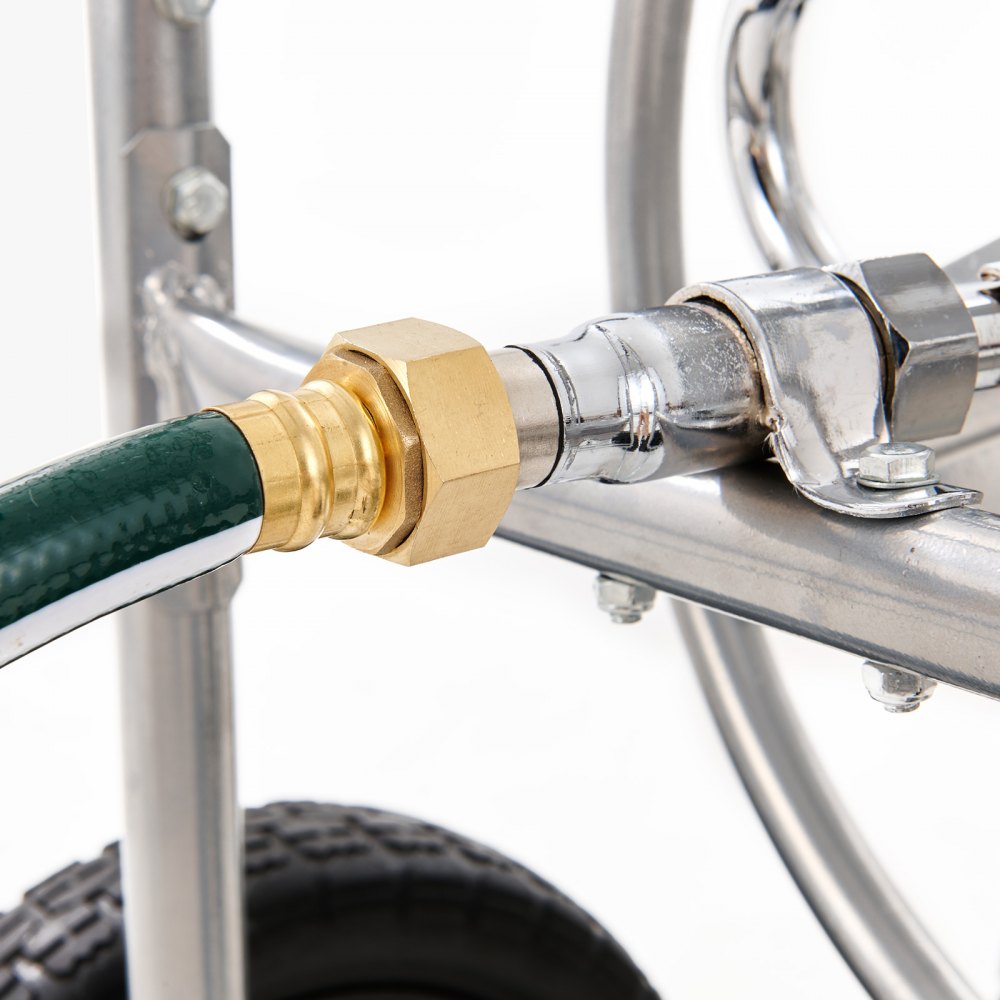 Construcción resistente a la corrosión: Fabricado con acero Q235A y conectores rápidos de latón, este carro para manguera de jardín ha superado rigurosas pruebas de resistencia a la niebla salina