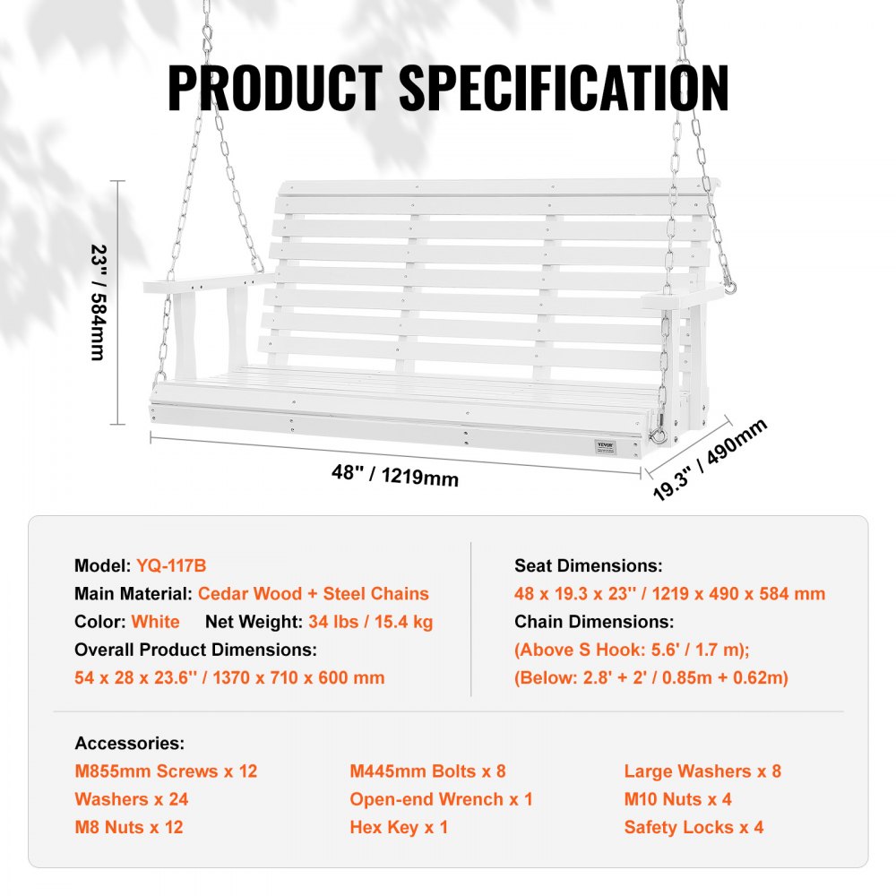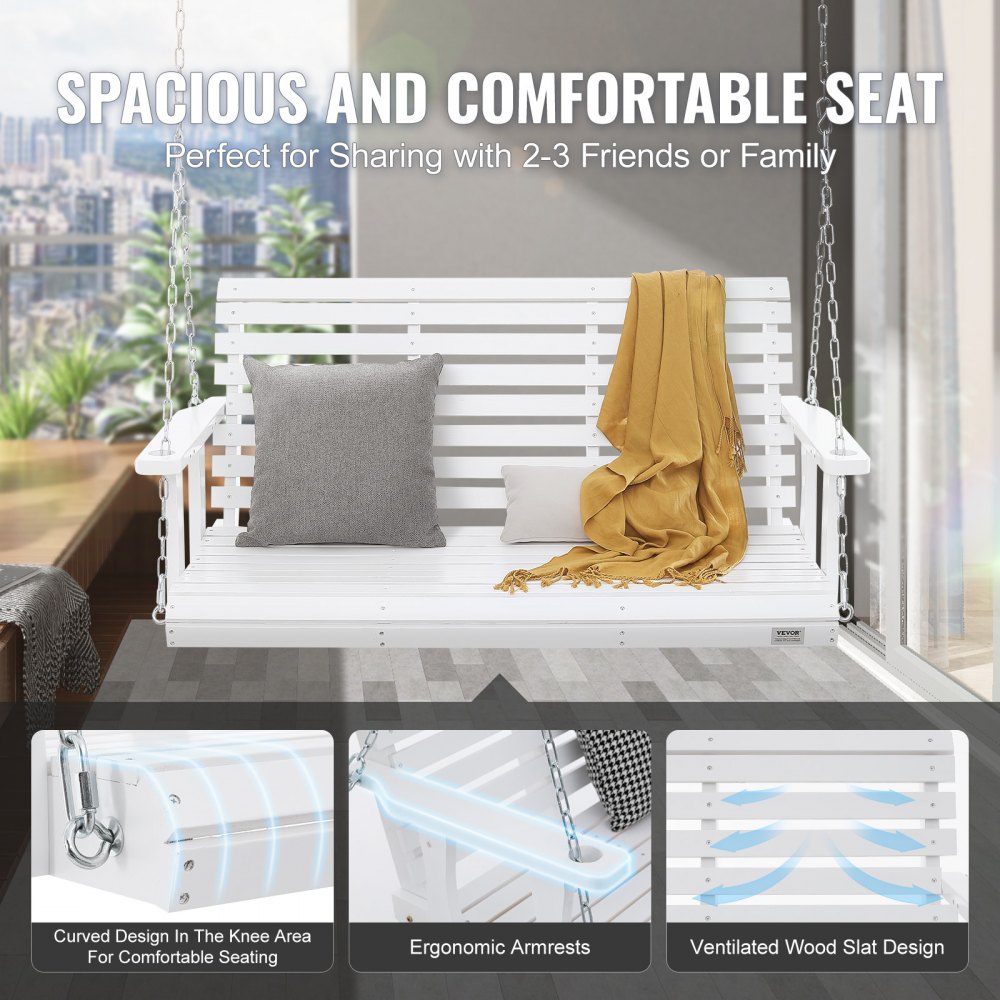 Diseño clásico: la combinación atemporal de madera maciza y cadenas de metal añade un toque de encanto retro a tu columpio de porche. Dimensiones totales: 54 x 28 x 23,6'' (1370x710x600 mm); Dimensiones del asiento: 48x19,3x23'' (1219x490x584mm), con capacidad para 2-3 personas cómodamente.