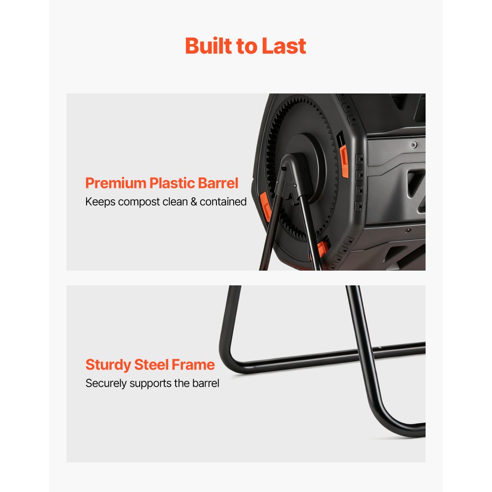 Construcción duradera para todo tipo de clima: Fabricada con un barril de plástico resistente y una estructura de acero con recubrimiento en polvo, el contenedor de compostaje resiste la oxidación, la luz solar y las inclemencias del tiempo. Está diseñada para usarse en exteriores durante todo el año