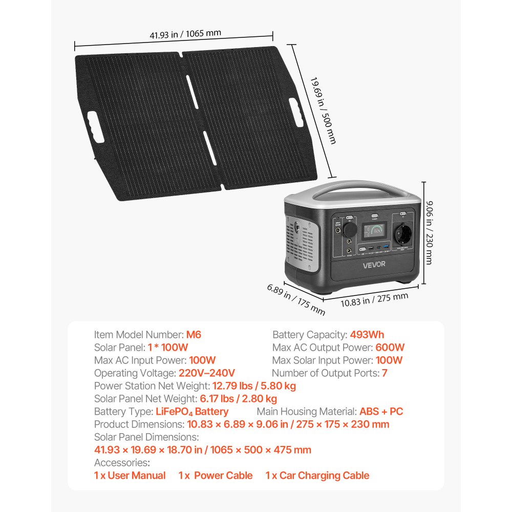 Estación de Energía Portátil 600 W con Panel Solar de 100 W, Generador de Energía Batería de Respaldo LiFePO4 de 493 Wh, con 7 Puertos de Salida para Hogar, Campamentos, Viajes en Autocaravana
