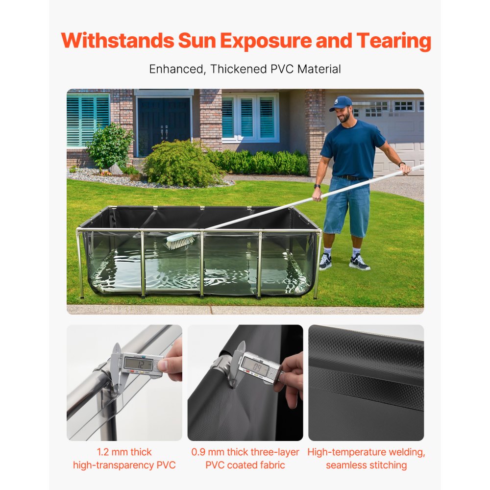 Materiales de alta calidad: Fabricado con tela rascadora de PVC de triple capa reforzada de 0,9 mm y PVC de alta transparencia de 1,2 mm, este estanque de lona para peces es duradero, resistente al sol y a los desgarros. Ofrece una visibilidad clara, es resistente al desgaste y a los arañazos, y su diseño sin costuras evita fugas