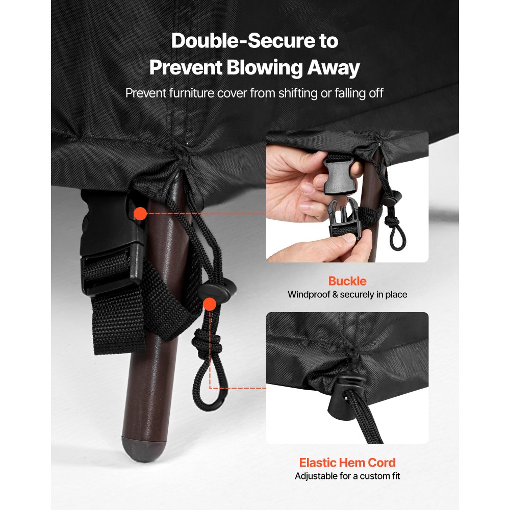 Diseño a prueba de viento: Equipada con hebillas y cordones elásticos en el dobladillo, esta funda para mesa de comedor al aire libre se fija de forma segura a sus muebles para evitar que se mueva o se vuele, incluso con vientos fuertes, lo que proporciona una protección confiable en todas las condiciones