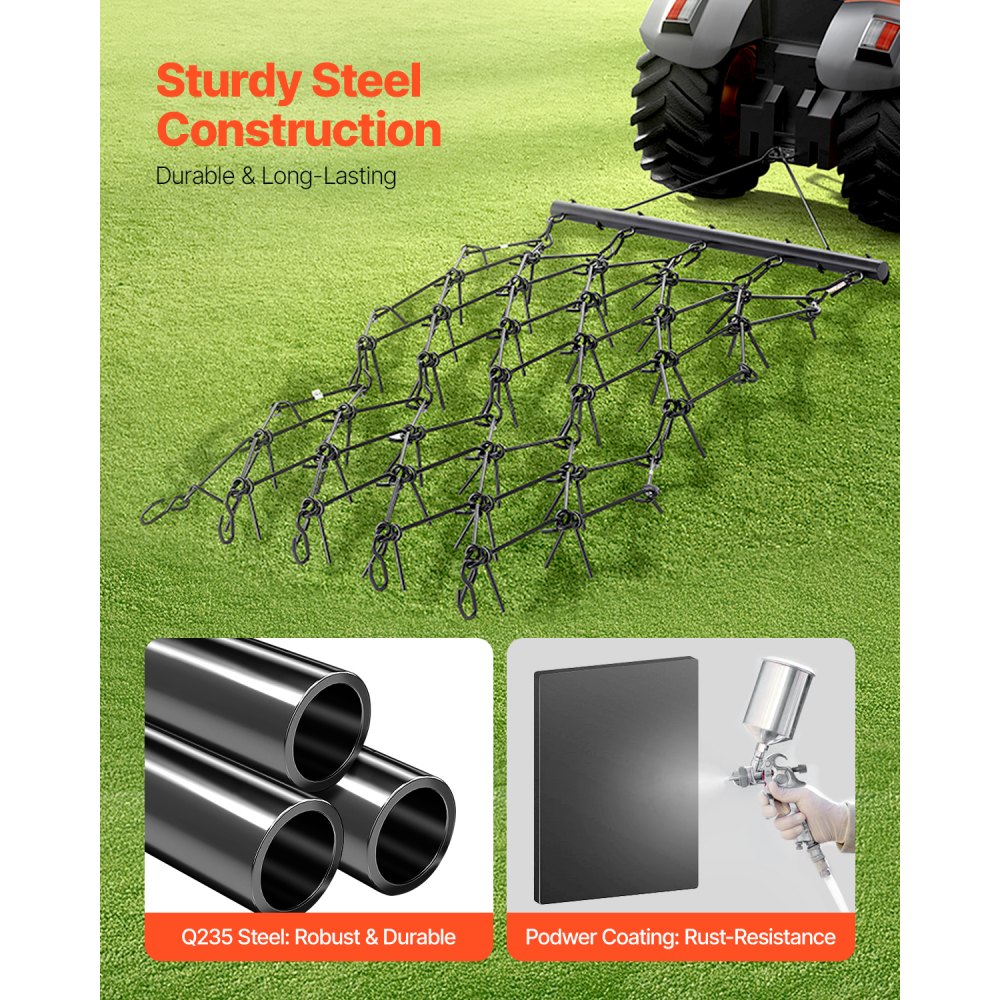 Amplia cobertura de terreno: Con unas dimensiones de 1707 x 1219 mm, se ocupa de una superficie más grande con cada pasada, lo que reduce la complejidad del trabajo y ahorra tiempo. El diseño sencillo del anillo de enganche permite una fácil conexión y, con una bola de remolque de 2 pulgadas (5 cm), este rastrillo de arrastre garantiza un funcionamiento suave y una mayor maniobrabilidad