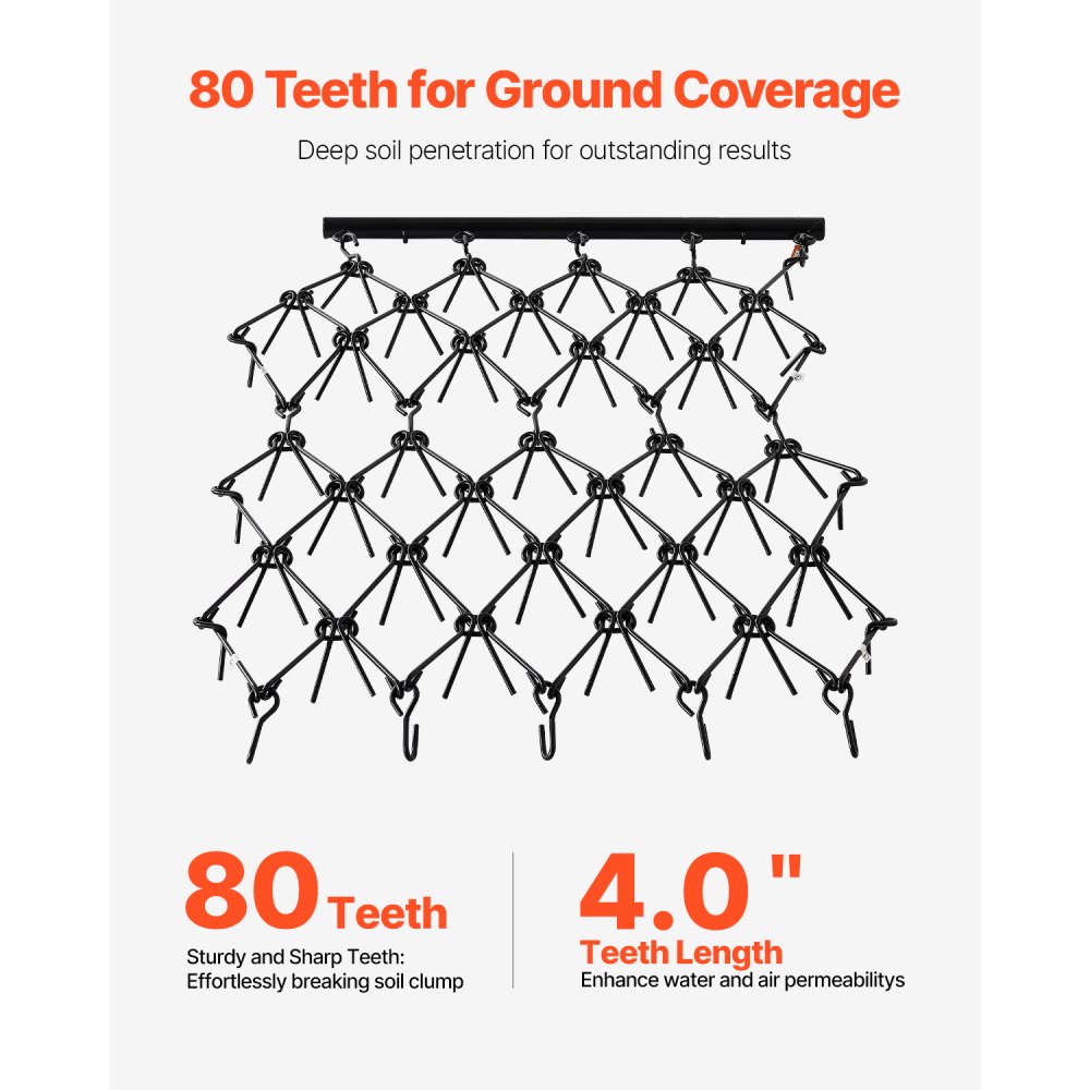 Efecto nivelador notable: Con 80 dientes, cada uno de 5,9 pulgadas (15 cm) de largo, esta grada de cadena rompe fácilmente los terrones y afloja el suelo duro, lo que garantiza una superficie lisa y refinada. Nivela el terreno de manera eficiente, lo que hace que la preparación del suelo sea rápida y efectiva