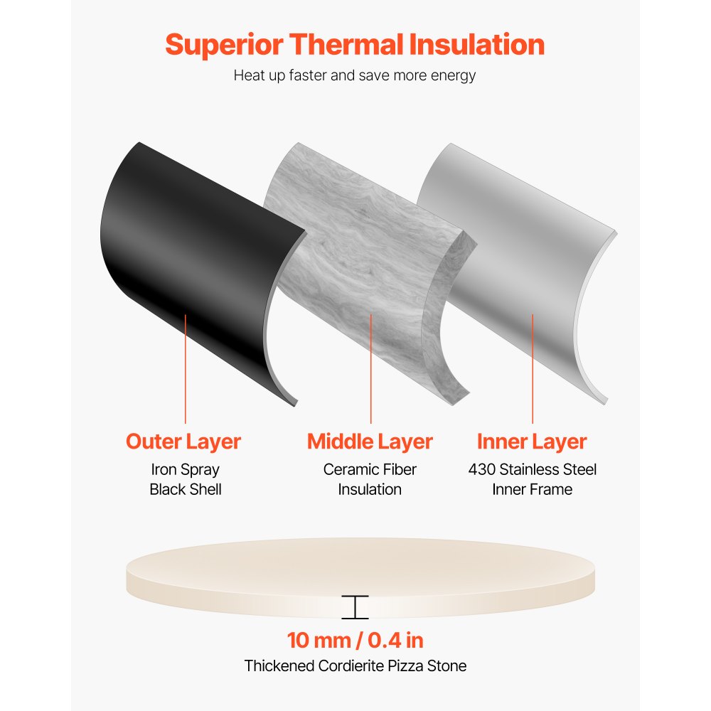 Construcción duradera: El horno de pizza resiste las condiciones exteriores y el uso frecuente. Su diseño de 3 capas promueve una eficiente circulación del calor. La carcasa negra con revestimiento de hierro pulverizado y un grueso algodón aislante garantizan durabilidad y una excelente retención del calor