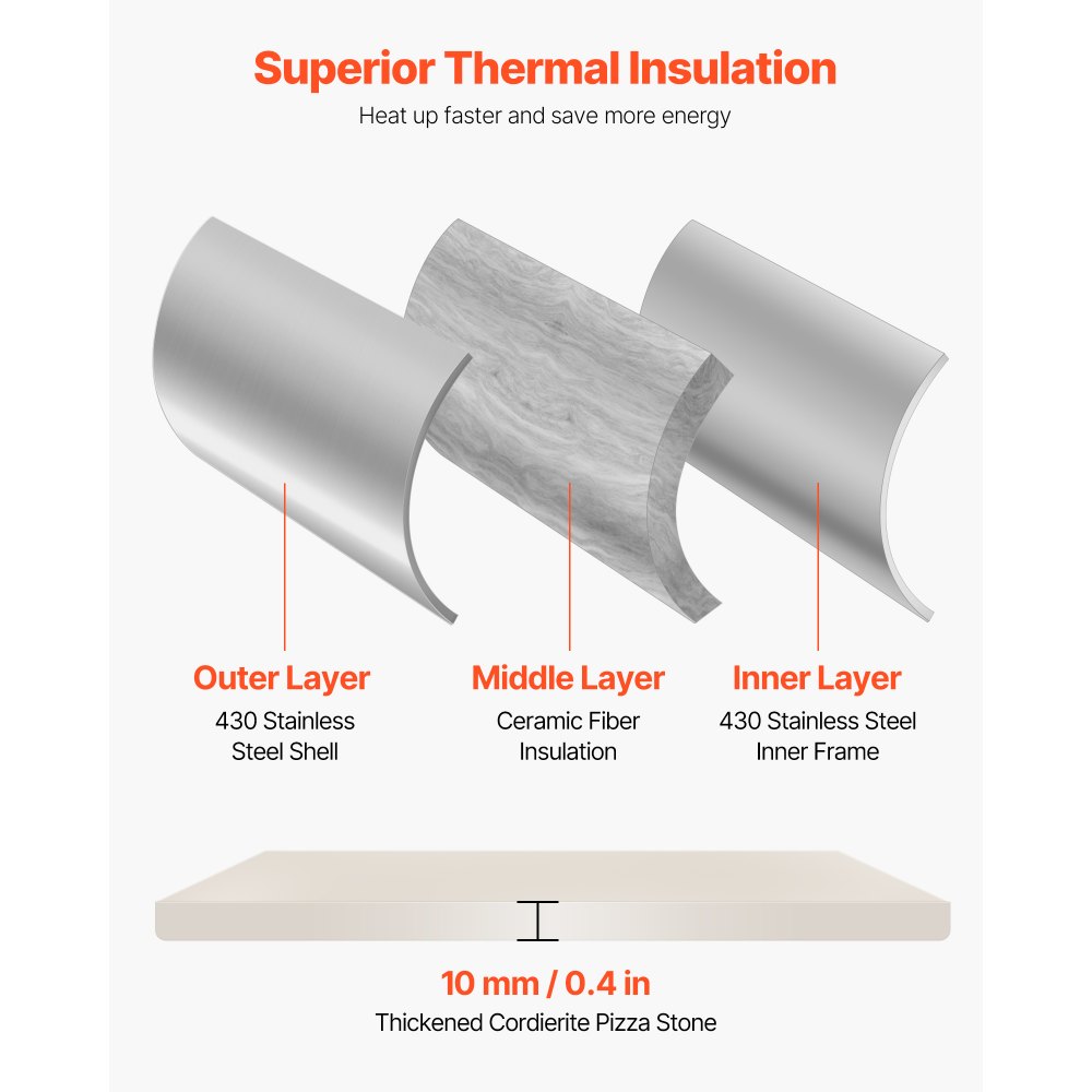 Construcción duradera: Este horno de pizza resiste las condiciones exteriores y el uso frecuente. Su construcción de 3 capas promueve una eficiente circulación del calor. Con una carcasa de acero inoxidable 430 y un grueso aislamiento de algodón, garantiza durabilidad y una excelente retención del calor