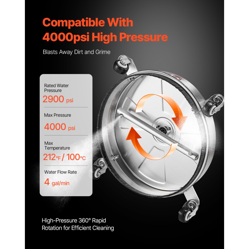 Limpiador de Superficies con Hidrolavadora, Acero Inoxidable, 4 Ruedas, de Forma Redondo, 27,58 Mpa máx., Varillas Extendidas, Mango Doble, para Concreto, Patio, Acera, 395 x 395 x 157 mm