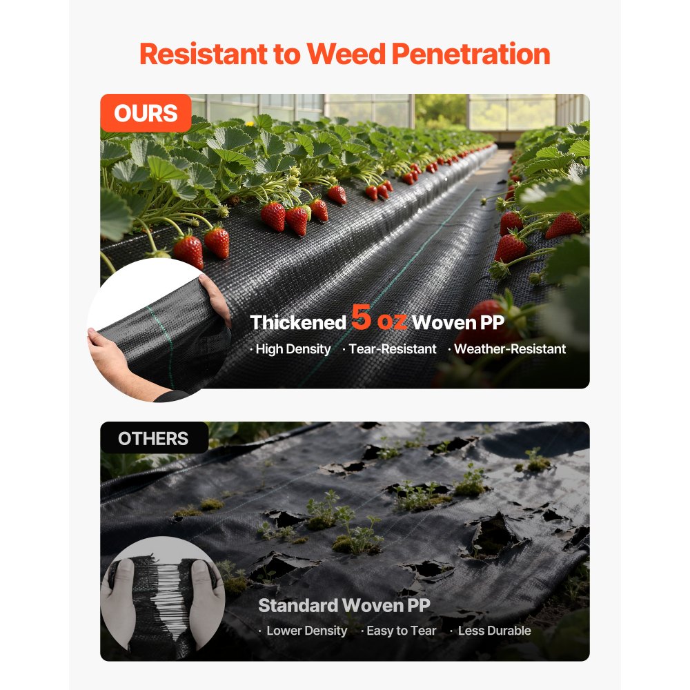 Intercambio de aire equilibrado: Con un diseño de tejido de PP que crea microespacios uniformes, esta malla antihierbas VEVOR permite que el agua, el aire y los nutrientes fluyan a través del suelo. Ayuda a prevenir el encharcamiento, promoviendo el flujo de aire y agua para favorecer el desarrollo radicular de las plantas