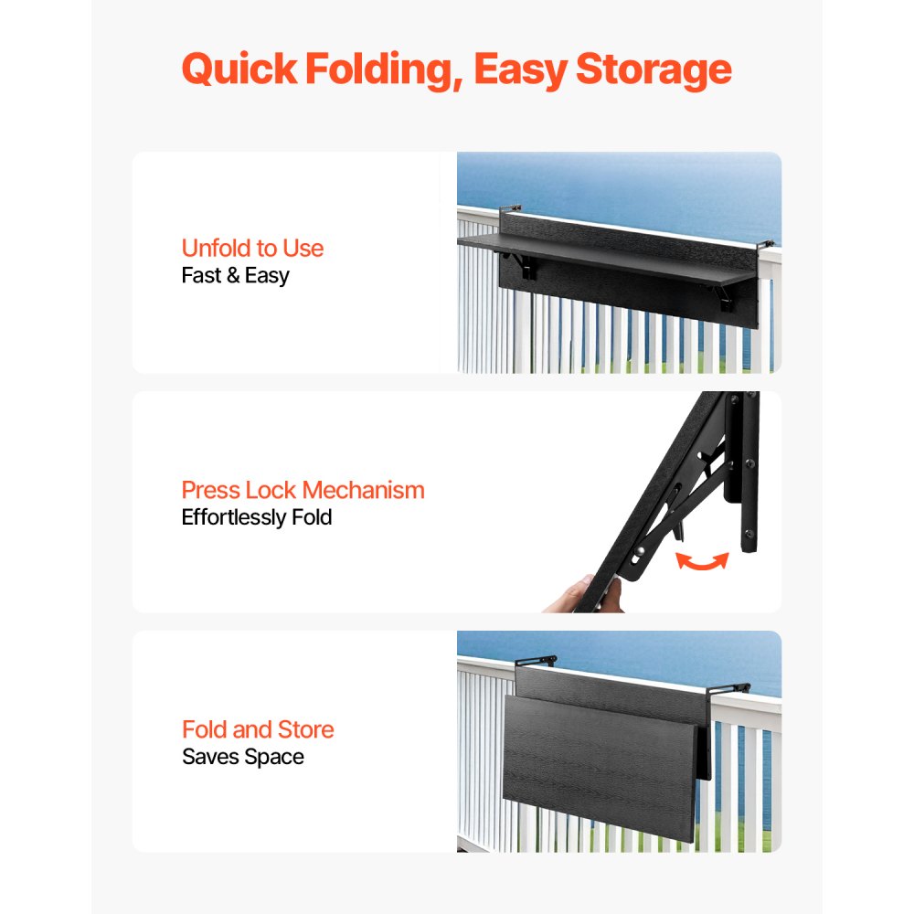 Ahorra espacio y es plegable: Cuando no la uses, simplemente presiona y pliega la mesa con barandilla para patio para ahorrar valioso espacio en el balcón. Su diseño compacto garantiza que no ocupe espacio innecesario, manteniendo tu área al aire libre ordenada y organizada