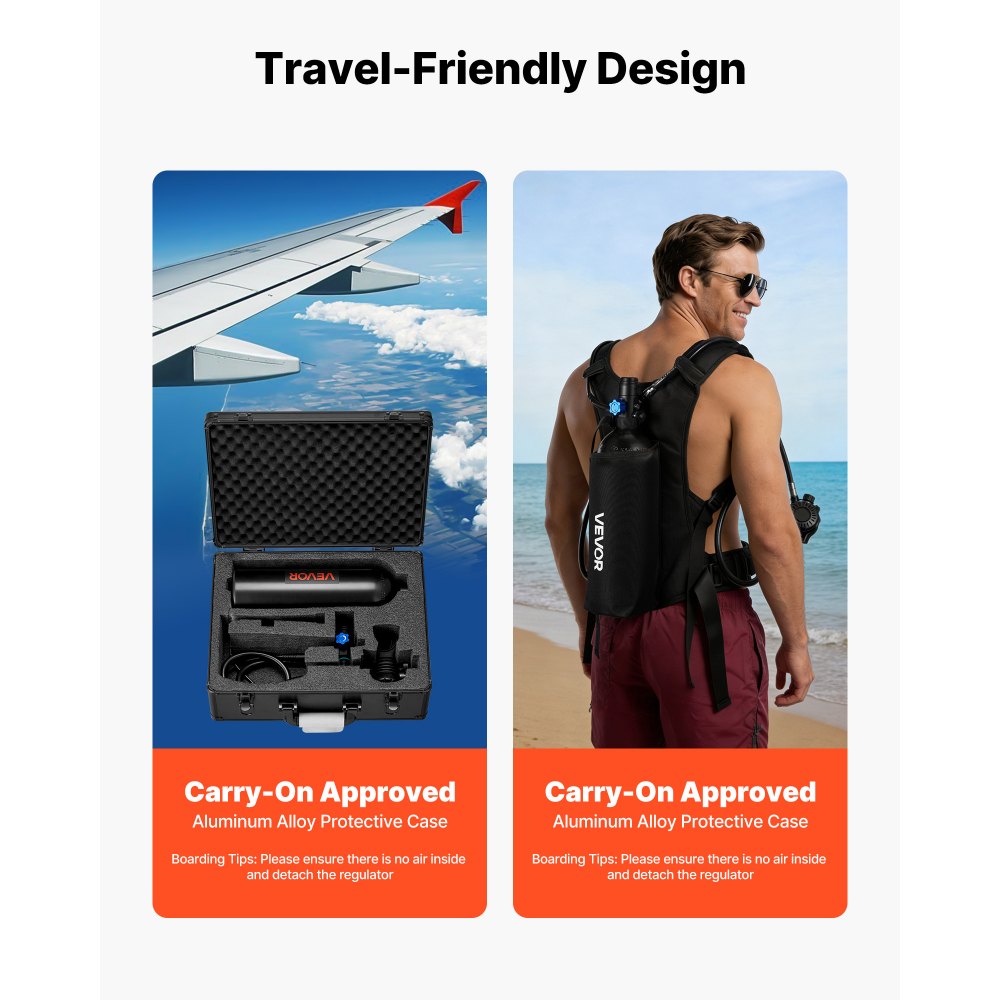 Fácil de transportar: Nuestro kit de tanque de buceo fue creado con la portabilidad en mente. Incluye una mochila para viajes a la playa y un estuche de aleación de aluminio con espuma de alta densidad para proteger el equipo. El tanque vacío se puede facturar para viajes en avión