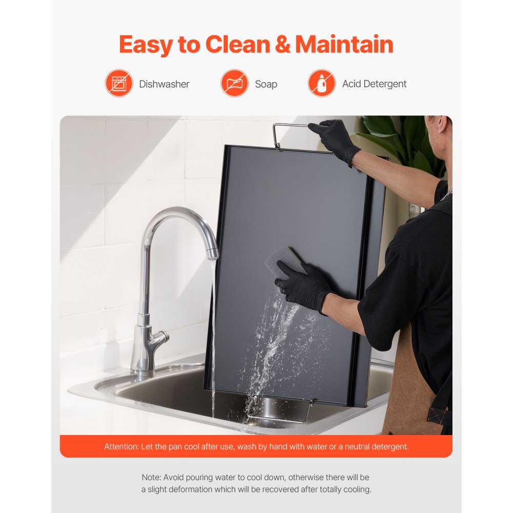Acero al carbono de alta calidad: Esta placa de parrilla de gas está hecha de acero al carbono duradero y puede soportar temperaturas de hasta 260 °C. Esto le permite cocinar a altas temperaturas. El refuerzo inferior en forma de X resiste la deformación