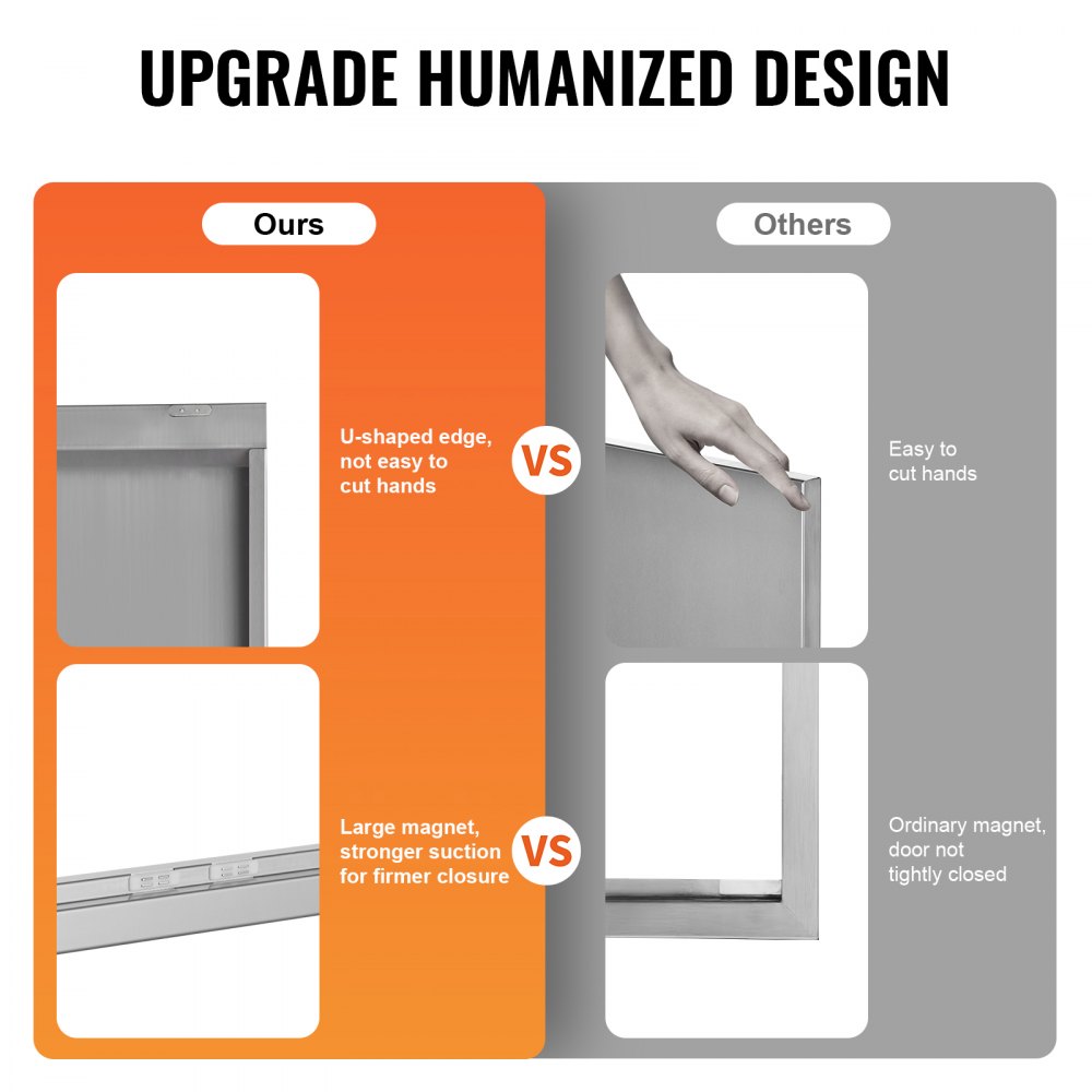 Diseño fácil de usar: Con un diseño de manija oculta, la puerta se ve mejor y reduce el riesgo de aplastamiento accidental. Los bordes del marco de la puerta están curvados y engrosados para garantizar un uso más seguro. Esto crea una experiencia más fácil de usar para que pueda disfrutar cocinando en su cocina al aire libre sin preocupaciones.