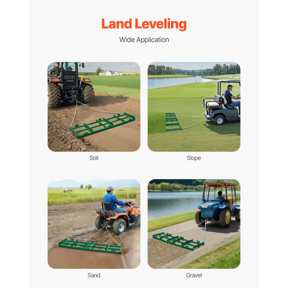 Aplicaciones versátiles: Este rastrillo de arrastre es ideal para nivelar tierra, césped, arena y grava. Es la herramienta ideal para nivelar campos, caminos de acceso, estacionamientos y más, lo que hace que las tareas de gestión de tierras sean eficientes y sin complicaciones