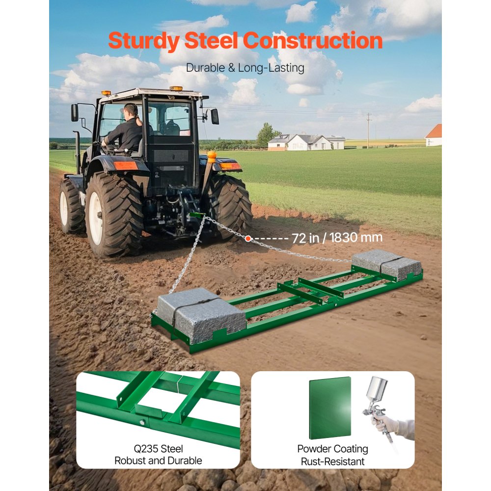 Amplio alcance y eficiencia: Con su ancho de 243,5 cm, esta grada de arrastre maneja de manera eficiente áreas grandes en una sola pasada, nivelando tierra, pasto, grava y rocas. Las barras transversales incluidas proporcionan peso adicional, lo que mejora la eficiencia de nivelación. Es ideal para granjas, jardines y caminos de grava, y funciona como una niveladora de caminos de acceso eficaz